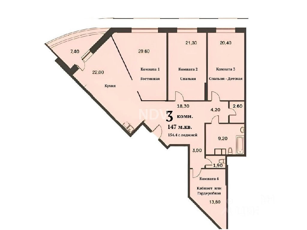 Общая площадь 147 кв.м (154,4 кв.м с лоджией), потолки 3 метра.